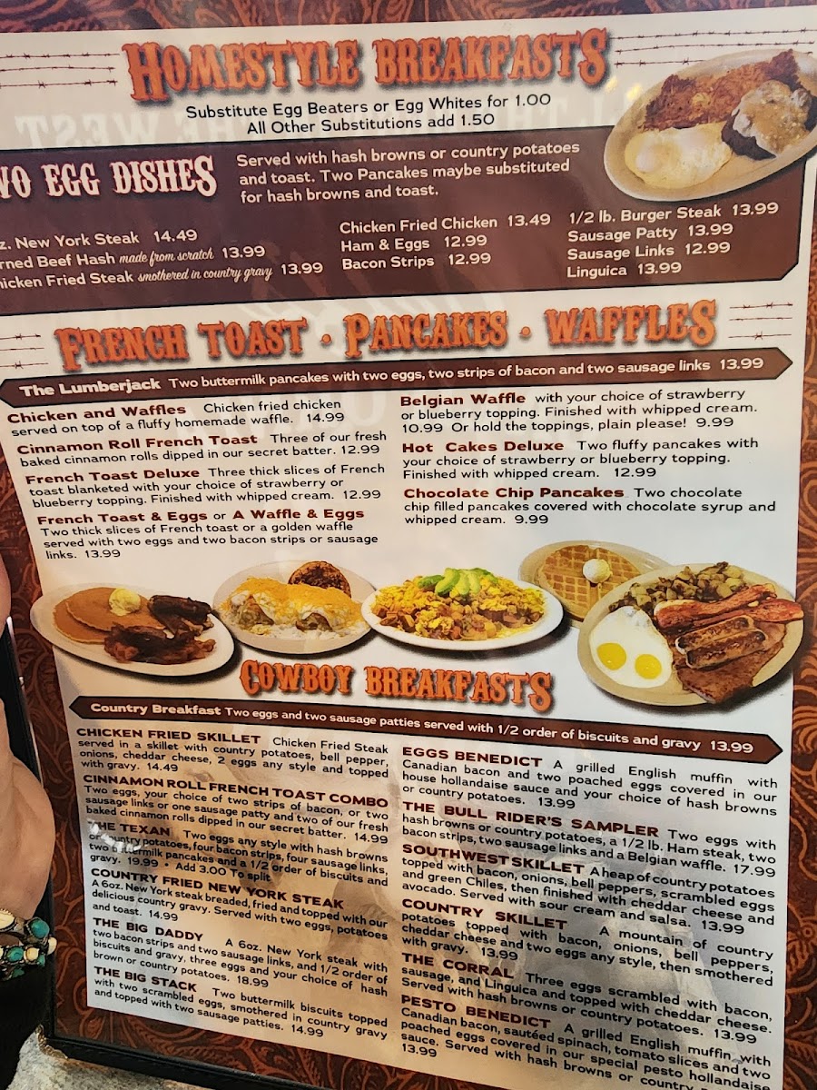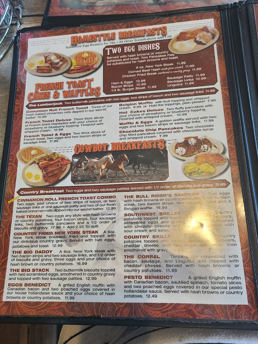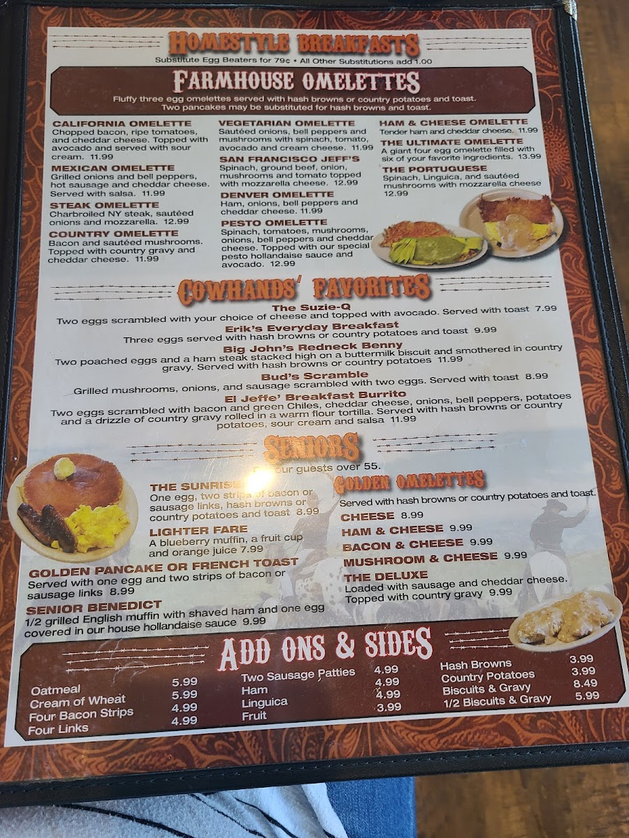 The breakfast offerings, affectionately known as "Cowhands' Favorites," include the indulgent SuzieQ, featuring scrambled eggs, cheese, and creamy avocado, and the hefty Big John's Redneck Benny, a comforting dish of poached eggs and ham on a biscuit, drizzled with rich country gravy.