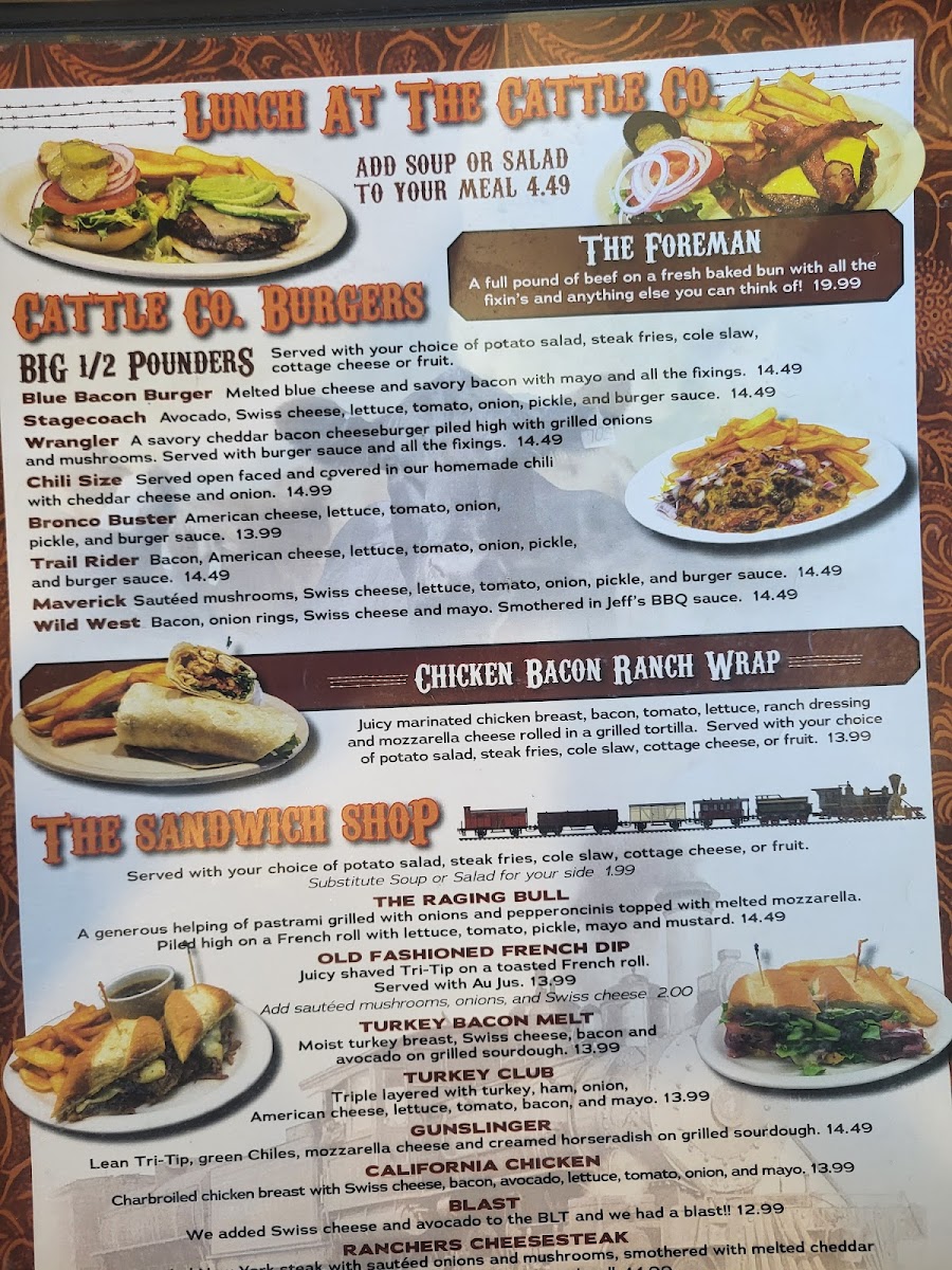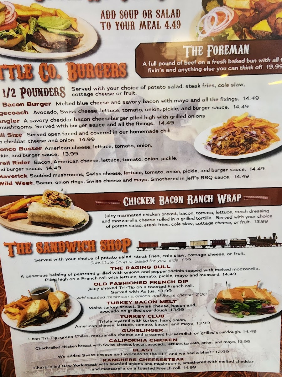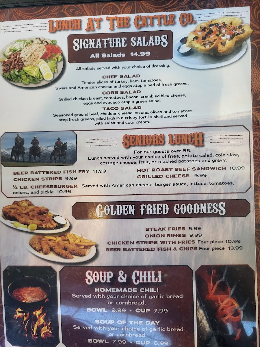 The breakfast offerings, affectionately known as "Cowhands' Favorites," include the indulgent SuzieQ, featuring scrambled eggs, cheese, and creamy avocado, and the hefty Big John's Redneck Benny, a comforting dish of poached eggs and ham on a biscuit, drizzled with rich country gravy.